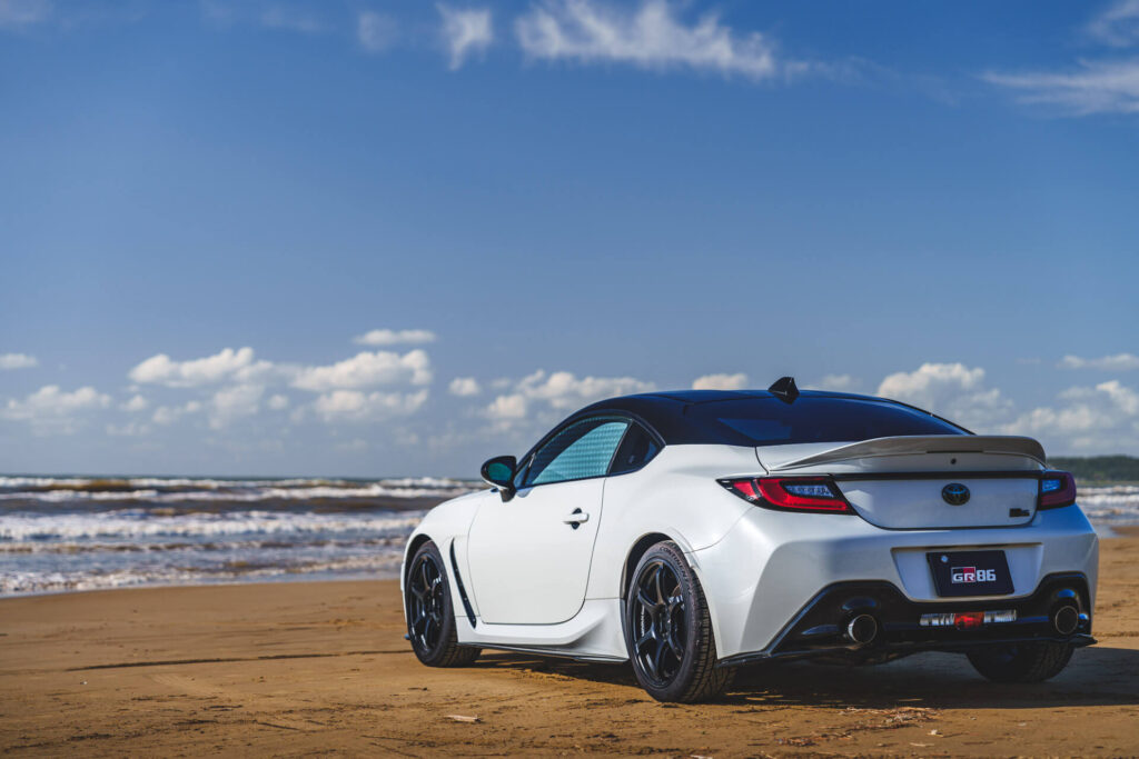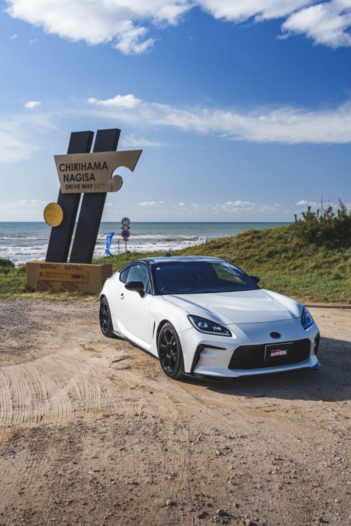 波打ち際に停めて俯瞰気味に撮影しました。