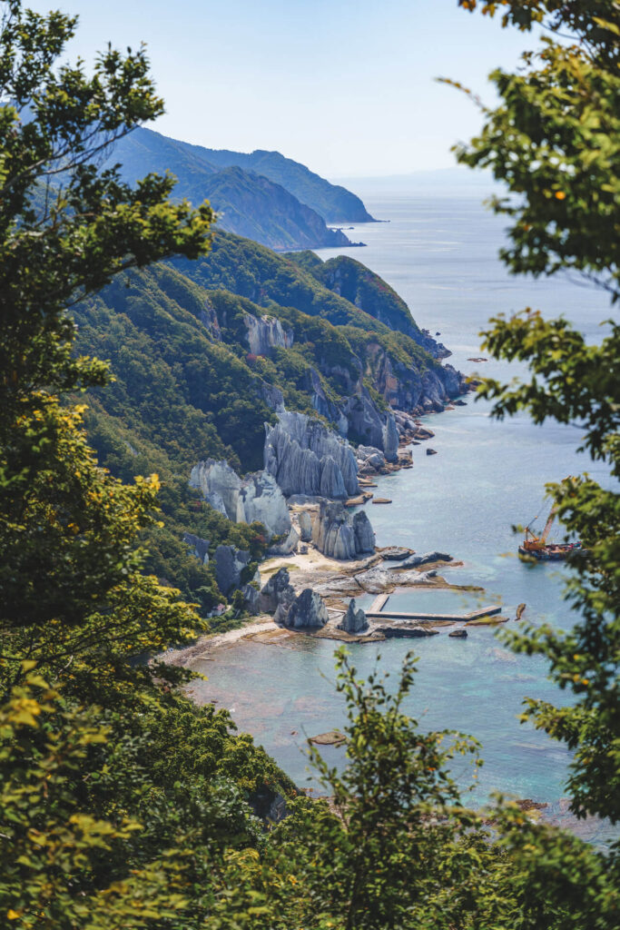 屹然と立ちつくす奇岩の数々。エメラルド色の海。