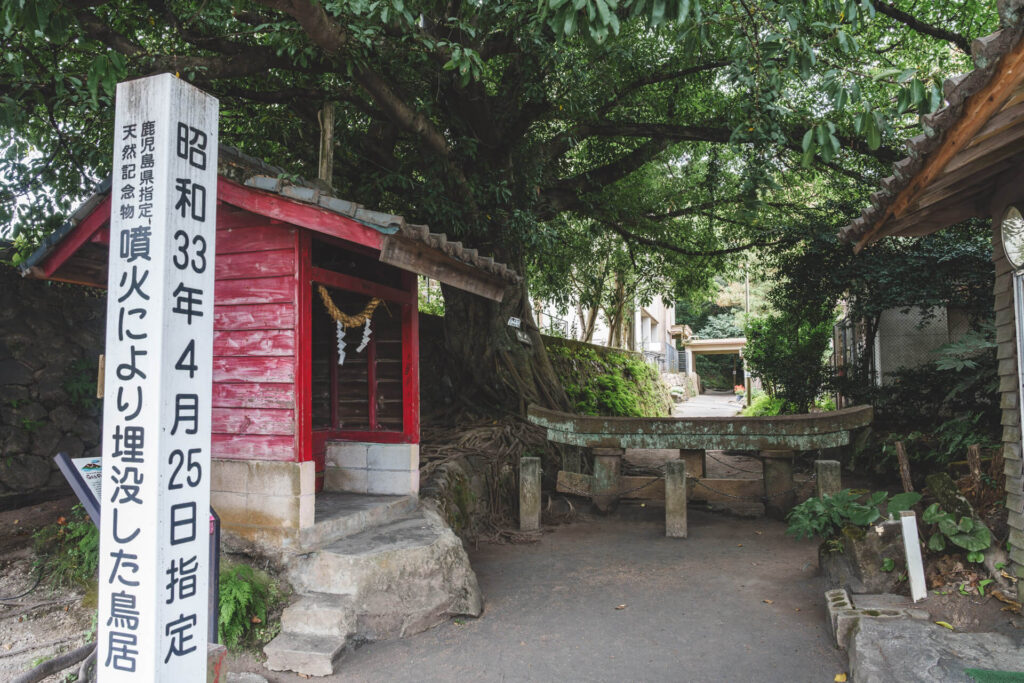 1914年(大正3年)に発生した桜島の大噴火(大正大噴火)による噴石や火山灰により、鳥居は上部を残して埋没。