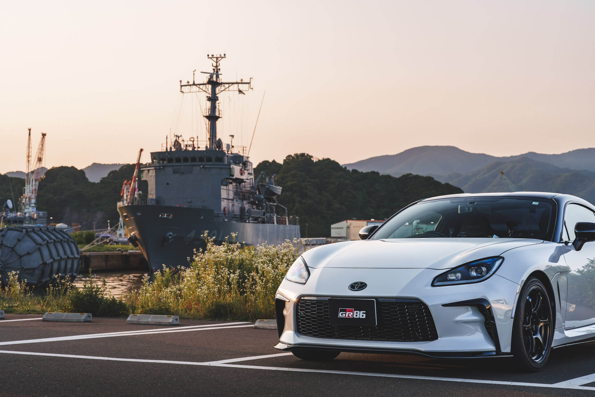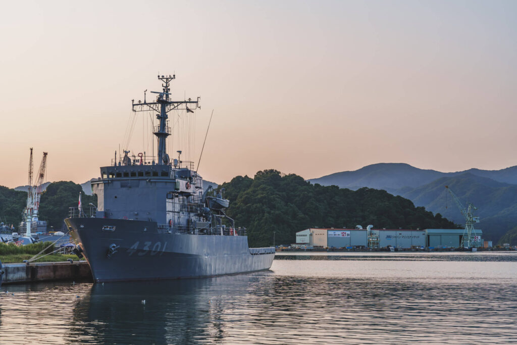 海上自衛隊の舞鶴造修補給所に接しており、駐車場の位置から停泊している艦船と一緒に撮ることができました。