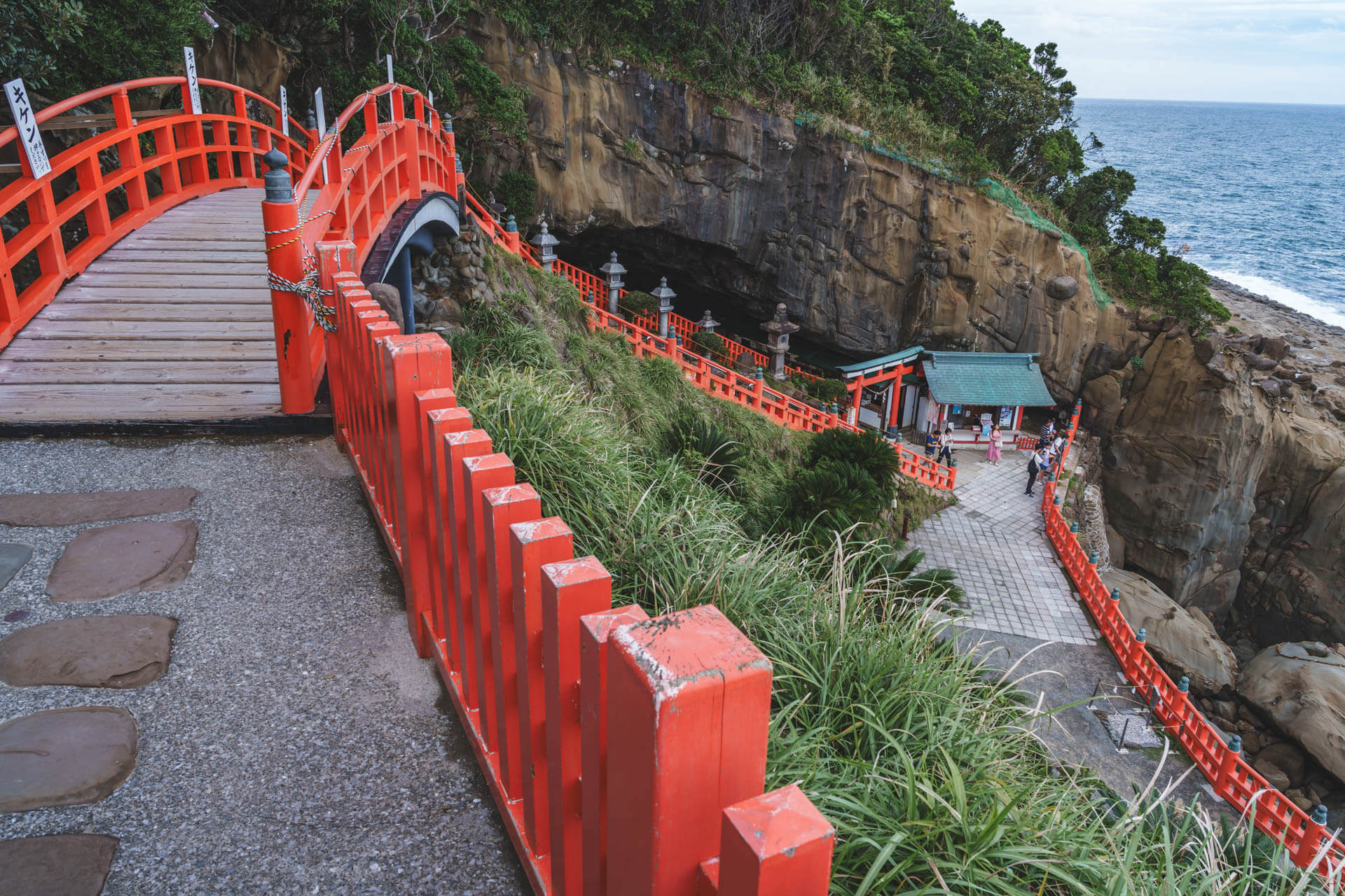 海に突き出た岬の海蝕洞内に本殿が鎮座する神秘的な光景を目にすることができます。